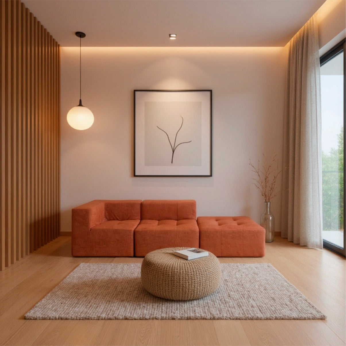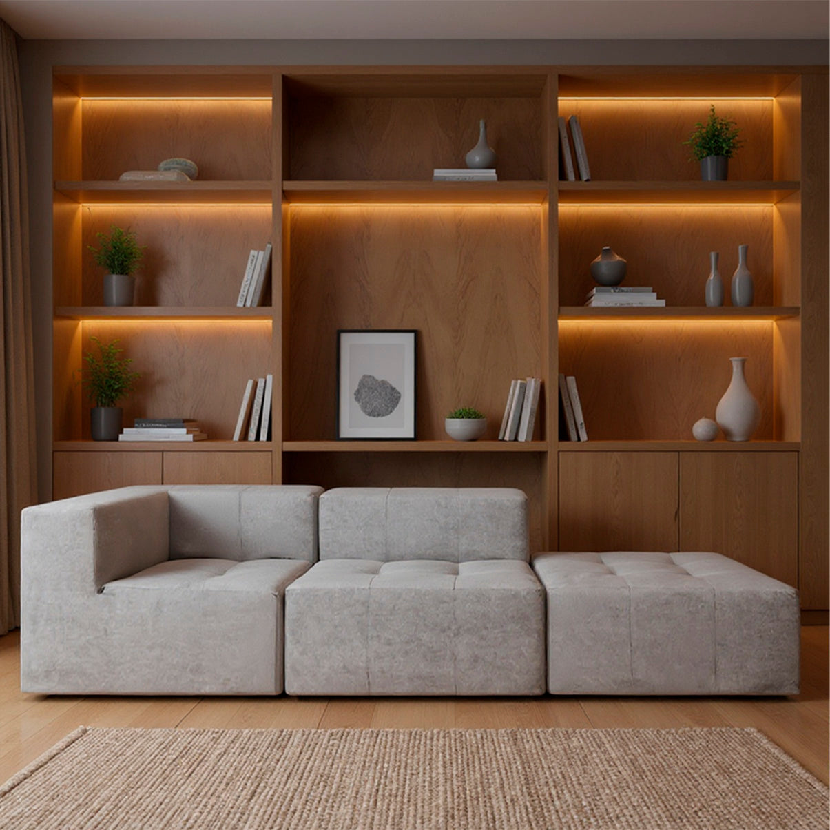 Você cria seu sofá como quiser. Em L, reto, com puff ou separado — você decide a vibe.